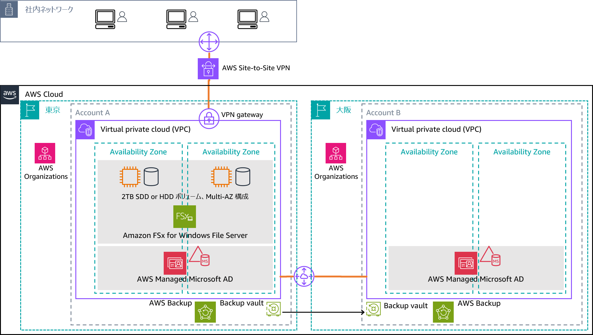 FSx for Windows は Active Directory での認証を必要としますので、この例では AWS Directory Service for Microsoft Active Directory の AWS Managed Microsoft AD(Standard Edition) の利用を想定しています。オンプレミスの Active Directory を利用する場合は、それを活用することが可能で、もしくは、オンプレミスの AD と AWS 上に構築する EC2 上の AD とレプリケーションすることで実装を検討することもできます。